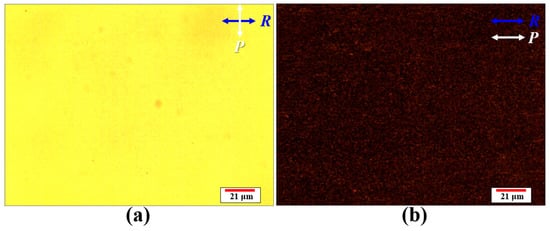 Microscopic images of the H-PNLC cell applied with 18.5 Vrms under the configurations consistent with those of (a) the red and (b) the blue curves in Figure 6 using a separate experiment. Blue (R) and white (P) arrows represent the rubbing directions of the two substrates of the H-PNLC cell and the polarization direction of the incident LP backlight of the microscope, respectively.