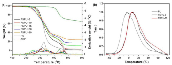 (a) Thermogravimetry/Derivative thermogravimetry (TG/DTG curves of neat PU and FSPUs with various ACP contents and (b) Tan δ curves of neat PU, FSPU-5 and FSPU-10.