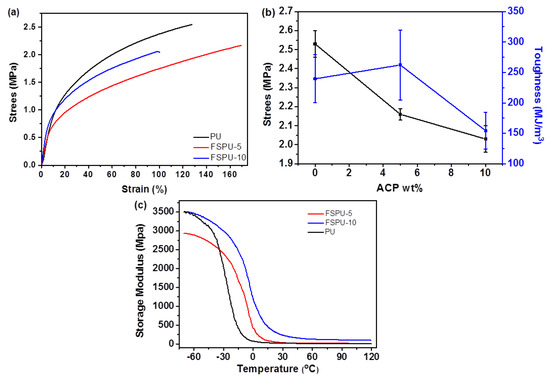 Tensile properties of neat PU and FSPUs with various ACP contents: (a) stress-strain curve, (b) stress and toughness versus ACP addition curve and, (c) E’ curves of neat PU, FSPU5 and FSPU-10.