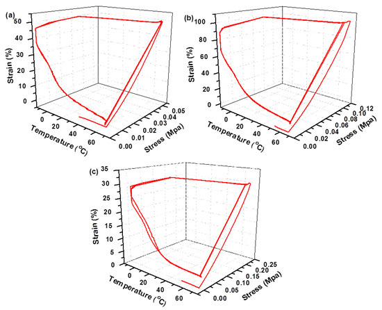 Shape memory test: The shape memory properties were evaluated with a DMA Q800 dynamic mechanic analyzer (TA Instruments, New Castle, DE, USA). In free strain recovery experiments, the tested specimen was clamped with an initial length of 30 mm in-between the grips of the tensile testing machine. Before starting, the compression stress was reduced to zero by moving one clamp until the specimen was in its unloaded state (initial strain εp = 0). Then the specimen was heated to Thigh = 70 °C using a heating rate of 5 °C·min−1 (±0.6 °C·min−1) and held for 5 min before the shape programming process was started. After that, the specimen was elongated to an absolute strain εm of 100%, using a strain rate of 0.050 S−1 (±0.002 S−1). Strain changes during heating process were included in εm. After holding the specimen at that temperature for 5 min, the constrained specimen was cooled to Tlow = −10 °C (±1 °C) with a cooling rate of 5 °C·min−1 (±0.6 °C·min−1) and kept under constant strain for another 5 min. Unloading the specimen with a rate of 5.0 N·min−1 (±0.4 N·min−1) and holding for 5 min to complete the shape programming process. Measure the strain εu of the new unconstrained temporary shape. Shape recovery was initiated by reheating the specimen to 70 °C with same heating rate. The onset temperature of shape (free strain) recovery was defined by the value of the tangent line through the inversion point of the shape recovery curve at the foregoing temporary force εu in the strain-time diagram. The corresponding temperature was taken as onset shape (free strain) recovery temperature Tr,onset. The residual strain associated with the recovered permanent force εp was measured after 5 min at Thigh. The entire first thermo-mechanical cycle (N = 1) was finished after this step. Subsequently, another 3 cycles were run with same elongation of the specimen.