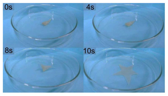As indicated in Figure 6, the sample almost can finish a complete cycle at 60 °C. To demonstrate the shape memory effect, we wish to use lower heating temperature and high fixing temperature experimentally. Therefore, 60 °C and 0 °C were employed, respectively. At the beginning, the star shape sample was heated to 60 °C before being deformed into a curved shape. Immediately thereafter, the deformed sample was placed in an ice water mixture (0 °C) for about 600 s to fix the temporary shape. After bringing back to the heat source, they return to the original shape. The FSPU-5 slowly opened from the initial fixed state and recovered within 10 s. The video S1 in the support information also showed the shape deformation and recovery process.