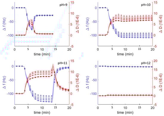 To investigate the interaction between hybrid vesicles and glass surfaces, we monitored the interaction between vesicles and surfaces using quartz crystal microbalance with dissipation (QCM-D) under different pH conditions. In the area of vesicle adsorption behavior, QCM-D is a well established technique which monitors the changes in resonant frequencies (Δf) and energy dissipation (ΔD), which correspond to changes in mass and viscoelasticity, respectively, of adsorbed films on a harmonic oscillator in real time [15]. These changes can be related to the thickness and the viscoelastic and hydrodynamic properties of the adsorbed layers. We exposed borosilicate-coated QCM-D sensors to a suspension of DOPC vesicles in Tris buffer solution adjusted to different pH conditions and monitored the frequency and dissipation at each of the odd overtones (Figure 2). At pH<9, we observed a decrease followed by an increase in overtone-normalized frequency, Δf/n (where n is the overtone number), to a stable equilibrium of −26 Hz after 5 min. These changes in frequency corresponded to a dramatic increase and then a decrease in acoustic dissipation to an equilibrium value of ΔD = 1 × 10−6, indicating a rigid film consistent with the adsorption-then-fusion of lipid vesicles to form an SLB. Performing the same experiment with vesicles in solutions at higher pH revealed three additional previously reported [11,15] pH-mediated QCM-D behaviors consistent with irreversible vesicle adsorption (pH = 10), reversible vesicle adsorption (pH = 11), and no adsorption (pH = 12).