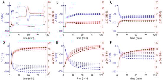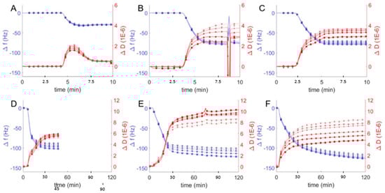 Frequency change (Δf/n, blue) and dissipation (ΔD, red) measurements from QCM-D monitoring of hybrid polymer/lipid vesicles in Tris buffer (pH = 7) interacting with plasma cleaned borosilicate glass, showing data from the 3rd through 13th harmonics, 3rd (□), 5th (○), 7th (∆), 9th (+), 11th (inverted triangles), 13th (◊). After establishing a baseline buffer solution measurement, vesicles composed of 100 mol % DOPC (A) and EO22Bd33 in varying amounts: 10 (B), 25 (C), 50 (D), 75 (E), 100 (F) mol % were introduced into the sample QCM-D sample chamber.