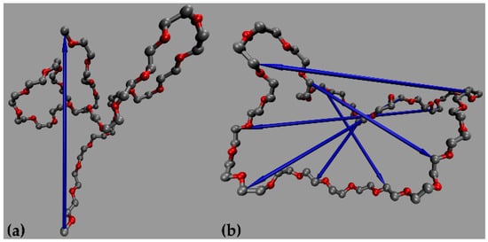 Definition of the characteristic vectors involved in the analysis of terminal orientational relaxation in linear and ring polymers. (a) The end-to-end vector Ree (blue arrow) in the case of a linear PEO chain, and (b) various diameter vectors Rd (blue arrows) in the case of a ring PEO molecule. Grey and red beads indicate carbon and oxygen atoms along a PEO molecule, respectively.