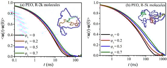 where Γ denotes the gamma function. The values of the set of the three characteristic constants for all blends simulated are reported in Table 2. For the stretching exponent β, values between 0 and 1 (β = 1 corresponds to the exponential function) are expected. The smaller the value of β from 1 the higher the degree of dynamic heterogeneity in the melt []. We observe that in all blends simulated here, the value of β is significantly smaller than its value in the corresponding pure ring melt, a direct indication that ring molecule dynamics in the presence of linear chains are more heterogeneous. The effect is more pronounced in the case of the PEO-5k blends, for which our simulations indicate rather small β values. For example, the value of β in the PEO-2k and PEO-5k blends with φL = 0.2 is smaller by ~9% and ~12%, respectively, compared to its value in the respective pure melt at the same temperature. An interesting observation is that by further increasing the concentration of linear chains to φL = 0.5, the value of β remains practically unaffected in the PEO-2k blend, whereas in the PEO-5k a reduction of ~25% is observed compared to the pure ring analog (R-5k melt). Increasing the concentration of linear chains even further in the two types of blends does not seem to affect the value of β anymore.