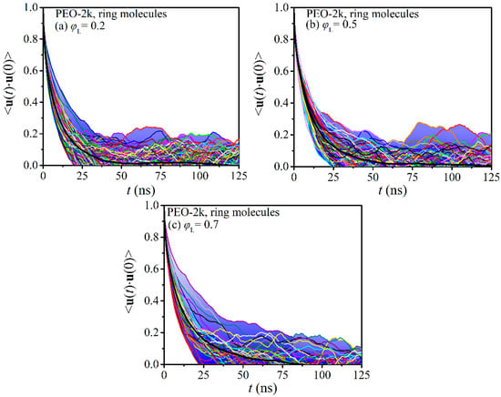 Decay of the time autocorrelation function for each ring PEO molecule separately in the simulated ring-linear PEO-5k blends at different concentrations of the linear component: (a) φL = 0.2, (b) φL = 0.5, and (c) φL = 0.7.