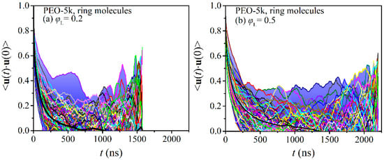 To shed additional light on the effect of molecular length and blend composition on the issue of dynamic heterogeneity in ring-linear blends, we calculated the TACF curves of all ring molecules in the two melts (PEO-2k and PEO-5k). In all cases, long MD simulations were performed to ensure that the individual TACFs for all ring molecules had dropped to zero. The results are collectively shown in Figure 3 and Figure 4, together with the average curve (thick black line) in each case. With blue, we have marked the area below those TACF curves that were found to deviate the most from the average curve.
