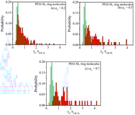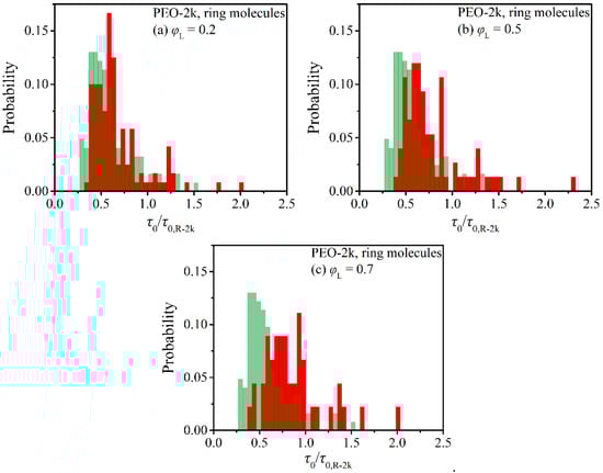 Histograms (red bars) of the characteristic ring orientational relaxation times in the simulated PEO-5k blends as a function of the fraction of linear chains: (a) φL = 0.2, (b) φL = 0.5, (c) φL = 0.7. Green bars represent the corresponding histograms in the pure ring melt from Ref. [].