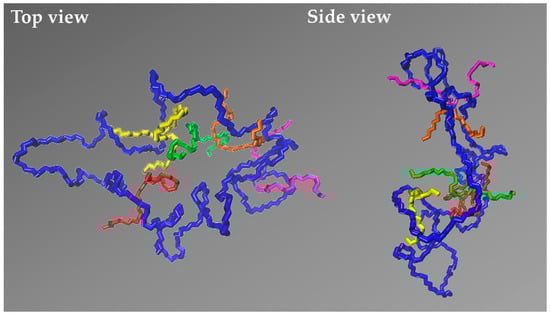 Overall, our simulations reveal that the dynamic heterogeneity in the simulated ring-linear PEO blends is strongly linked to the size of the two components, also to their relative population. The rather long linear chains in the 5k blends can thread more rings than the shorter linear chains in the 2k blends; and similarly, the larger PEO-5k rings experience more penetrations by linear chains than the smaller PEO-2k rings. Moreover, increasing the relative population of linear chains in the longer PEO-5k blends increases the probability to observe multiply threaded rings. As has been discussed by Tsalikis and Mavrantzas [], in the marginally entangled PEO-5k ring-linear blend at φL = 0.75, more than 90% of the rings are threaded by linear chains and more than ~45% of the threaded rings are multiply threaded. It is these multiply threaded rings that are responsible for the shift of the median of the distribution to higher relaxation times and the emergence of the extended tail in the regime of long relaxation times ( ≥ 2) in the PEO-5k blends compared to the PEO-2k ones. A characteristic example of a multiply threaded ring from our MD simulations with the 5k blend at φL = 0.5 is illustrated in Figure 7, with the ring and the linear PEO molecules involved in the threading depicted in their detailed atomistic representation. The blue ring is simultaneously threaded by five different linear chains (the yellow, the green, the orange, the magenta, and the red).