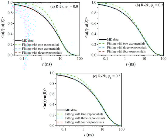 Decay of the ensemble-average TACF describing relaxation at the level of the ring diameter vector for R-2k rings in (a) their pure melt, (b) the R-2k blend with φL = 0.2, and (c) the R-2k blend with φL = 0.5. The dashed lines are best fits to the MD data with Equation (3).