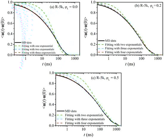 Decay of the ensemble-average TACF describing relaxation at the level of the ring diameter vector for R-5k rings in (a) their pure melt, (b) the R-5k blend with φL = 0.2, and (c) the R-5k blend with φL = 0.5. The dashed lines are best fits to the MD data with Equation (3).