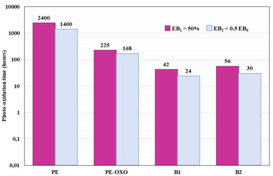 In Figure 2 the photo-oxidation times at which all the films reach the elongation at break equal to 50% (EB1) and to one half (EB2) of the initial value (EB0) are reported.