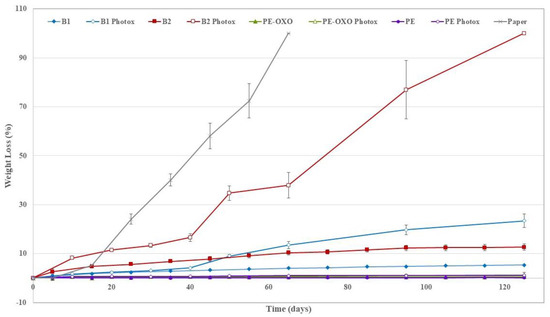 The positive control (paper) and B2 sample photo-oxidized for 56 h were totally disintegrated (WL = 100%) respectively after 65 and 125 days of soil burial test (Figure 3). The complete disintegration in soil of the B2 sample photo-oxidized for 56 h suggests that the photo-oxidation is not limited to the surface but occurred throughout the matrix bulk, in agreement with the literature [13]. WL values of B1 (Figure 4a) are remarkably lower than that of B2 (Figure 4b) samples. The photo-oxidized samples of all the films show a more pronounced WL than the corresponding virgin samples (Figure 4 and Figure 5). This holds also for the PE-based films, but the final values of the WL are almost negligible although the photo-oxidized PE-OXO film (Figure 5a) shows WL values slightly larger than that of the pure PE (Figure 5b). On the contrary, the weight losses of the two biodegradable samples are quite similar for the virgin films. WL curves of B1 and B2 photo-oxidized samples shows a comparable trend with an induction period (40 days) and then a rapid increase.