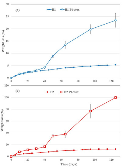 Average weight loss values (%) vs. degradation time for the film samples (a) B1 and (b) B2, virgin and photo-oxidized.