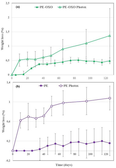Average weight loss values (%) vs. degradation time for the film samples (a) polyethylene (PE)-OXO and (b) PE, virgin and photo-oxidized.