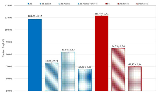 The wettability of the film surfaces submitted to UV irradiation was determined by contact angle measurements. In fact, chemical modifications on the surface of the thin films, induced by UV irradiation and/or soil degradation, increase plastic samples wettability, highlighted by CA decrease (Figure 6 and Figure 7) and, consequently, the microbial susceptibility is encouraged. The UV induced increase in surface wettability is more pronounced for photo-oxidized and buried B1 (Figure 6) samples (CA ~68°) as well as for photo-oxidized B2 films (CA ~70°, Figure 6). CA decrease is reasonably related to the formation of hydrolytic chain ends. In photo-oxidised and buried B1 samples the CA is quite similar to that of B1 buried (Figure 6). This could be related to the surface erosion and the removal of the oligomeric species produced by hydrolysis.