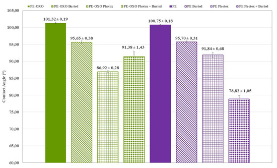 In a similar way, the increase in the wettability of the irradiated PE (Figure 7) and PE-OXO (Figure 7) samples can be attributed to the formation of hydrophilic groups on the polymer surface by photo-oxidation, which occurs by the exposure of PE to UV irradiation in the presence of air [22,23]. The photo-degradation of PE samples, promoted by the oxo-degradable additive, induces a more marked decrease in the contact angle because of the introduction of carbonyl groups (Figure 7). However, wettability is higher in photo-oxidized and buried PE sample (CA ~79°, Figure 7) than in photo-oxidized and buried PE-OXO (CA ~91°, Figure 7). This can be reasonably due to the higher WL and thus faster surface erosion of oligomers, bearing hydrophilic chain ends, in the PE-OXO (Figure 5a) than in PE sample (Figure 5b).