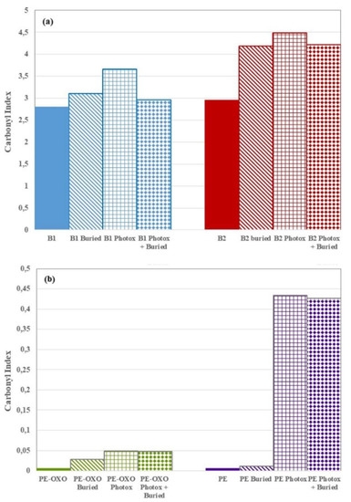 The increase of the carbonyl groups was a marker of the photo-oxidation evolvement as well as of hydrolytic reactions taking place during soil degradation. Unsurprisingly, in agreement with the literature [13,14], the spectra of the two biodegradable polymer-based films show that both photo-oxidation and degradation in soil increase the CI (Figure 8a). Remarkably, the area ratio of photo-oxidized + buried B1 and B2 sample is lower than that photo-oxidized and similar to the not photo-oxidized and buried ones. This result suggests that the oligomers, bearing carbonyl groups, have been partially removed from the surface during the soil burial test. However, B1 films were clearly more vulnerable to photo-oxidation than to hydrolysis; photo-oxidation products were removed by degradation in soil and CI of “B1 photox + buried” was lower than “B1 photox” sample (Figure 8a). Compared to the virgin samples, the increase of CO functional groups, due to the combined photo-oxidation and soil degradation, was significantly more evident in the B2 than in the B1 samples; in fact, the UV irradiation did not accelerate the WL rate as it did in the B2 films (Figure 4). These results were in agreement with the degradation process and the choice of monitoring degradation in soil through weight loss. Actually, the B2 films were much more prone than the B1 ones, since monomers and low-molecular-weight oligomers were originated and removed in the erosion step faster than in the B1 sample.