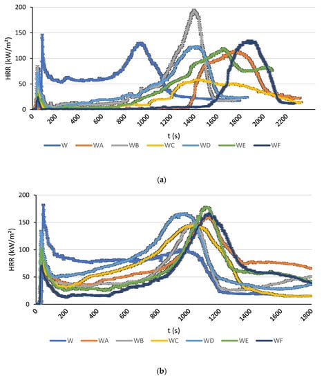 At 40 kW/m², the HRR curves of the coated specimens began to converge towards the one of the unprotected materials. It was difficult to determine which coating offered the best result regarding the reduction of the HRR. As it follows from Figure 2b, from the start of the test to about 975 s, the HRR for the sample with the coating F was lower than that of the other protected specimens, but afterwards it became somewhat higher compared to other samples over the remaining time interval.