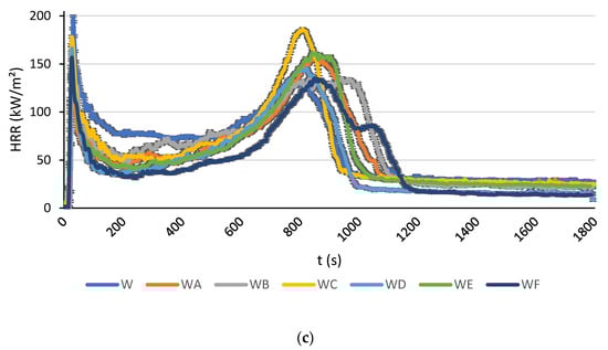 The Heat Release Rate (HRR) as a function of time for a thermal flux of: (a) 30 kW/m²; (b) 40 kW/m²; (c) 50 kW/m².