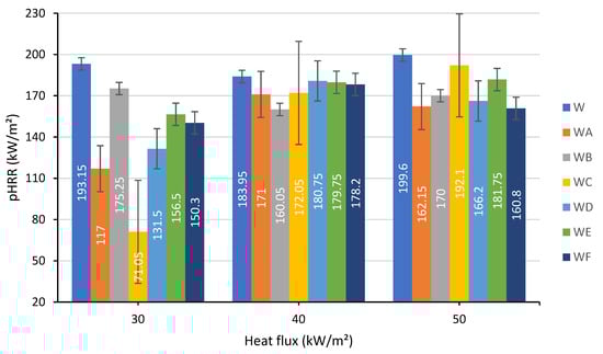 Similar overall trends were observed for the values of the peak Heat Release Rate (pHRR) (Figure 3). The pHRRs were distinct from each other at a lower heat flux of 30 kW/m², while the differences were narrowed at higher levels. Nevertheless, regardless of the level of heat flux, the application of all tested coatings had led to a reduction in the pHRR values. At 30 kW/m², the coating C containing TiO2 and ES, performed better than others: pHRR was reduced to 71.05 kW/m² compared to 193.15 kW/m² for the unprotected wood. On the other hand, at 50 kW/m², the coating C was rated as the worst performing in regard to reducing the pHRR; it was merely better than the original wood sample. At this level of heat exposure, the application of F, A, D and B coatings onto wood surface lowered the pHRR from 199.6 kW/m2 for the unprotected wood to: 160.8 kW/m² for the wood painted with the formulation F; 162.15 kW/m² for one with the formulation A; 166.2 kW/m² for one with the formulation D; and 170.0 kW/m² for one with the formulation B. Thus, we can observe that the intumescent formulation that combines both industrial fillers (TiO2 and Al(OH)3) and bio-fillers (RHA and ES) was the most efficient in terms of controlling the rates of heat release at higher heat flux levels. Under the influence of the radiative heat, the intumescent coatings expand, thus leading to a drop in the quantity of heat received by the wood surface. The obtained results correlate with the findings of the earlier study involving the application of similar formulations on to steel substrates []. However, any statement related to the HRR is limited due to the high uncertainty linked to the measurements.