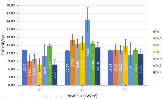 The average EHC values for tests carried out at different heat fluxes, 30, 40 and 50 kW/m², are shown in Figure 4.