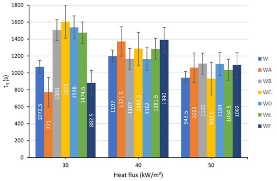 As it follows from Figure 6, at the heat flux of 30 kW/m², the application of the coating A, containing titanium dioxide and rice husk ash, and the coating F, combining all four fillers, significantly shortened the flaming duration compared to the uncoated wood substrate; whereas the formulations B, C, D and E prolonged the flaming stage. At higher levels of thermal flux, 40 and 50 kW/m², it was not possible to identify the best coating option due to the lack of a clear trend. However, the duration of the flame can be investigated alone without measuring other parameters such as HRR.