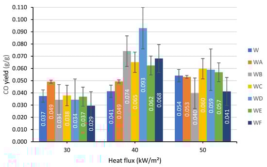 The CO yields measured at a heat flux of: 30, 40 and 50 kW/m².