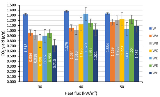 The CO2 yields measured at a heat flux of: 30, 40 and 50 kW/m².