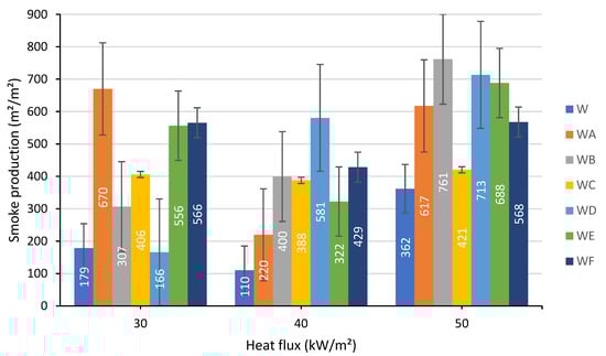 Generally, the exposure of the wood samples coated with the intumescent formulations A–F at all three levels of heat flux contributed to a growth of the smoke production compared to the uncoated wood, with the exception of the coating D at 30 kW/m² when the smoke production slightly dropped (Figure 9).