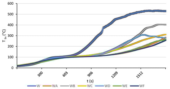 When a sample protected with the intumescent formulation was exposed to a heat flux of 30 kW/m² the coatings reacted accordingly, with the expected foam-forming and a production of a carbonaceous protective layer. From about 650 s onwards, the back-surface temperature of the uncoated wood sample increased rapidly and remained about 100–250 °C higher compared to the painted specimens. It is evident that the intumescent action of all tested coatings led to a marked delay corresponding to the start of the back surface temperature growth. In addition, the temperature rises significantly slower for all the protected specimens as opposed to the unprotected one. The decline of Tbs recorded at around 1500 s on the graph for the sample with the coating D can be attributed to a detachment of the substrate from the thermocouple (Figure 11). It can be concluded that the most effective thermal protection was offered by the coating F, combining two industrial and two bio-fillers (TiO2:Al(OH)3:RHA:ES = 2.5 wt.%:2.5 wt.%:2.5 wt.%:2.5 wt.%,), closely followed by the coating A and then by the coating E. Indeed, the increase in Tbs for the wood sample coated with the formulation F was delayed to 990 s with the highest temperature reaching around 250 °C, compared to 530 °C maximum for the uncoated sample.