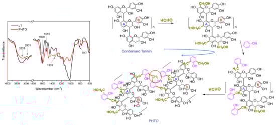Fourier transform infrared (FTIR) spectra and the proposed reaction of larch tannin (LT) and phenolic hydroxymethylated tannin oligomer (PHTO).