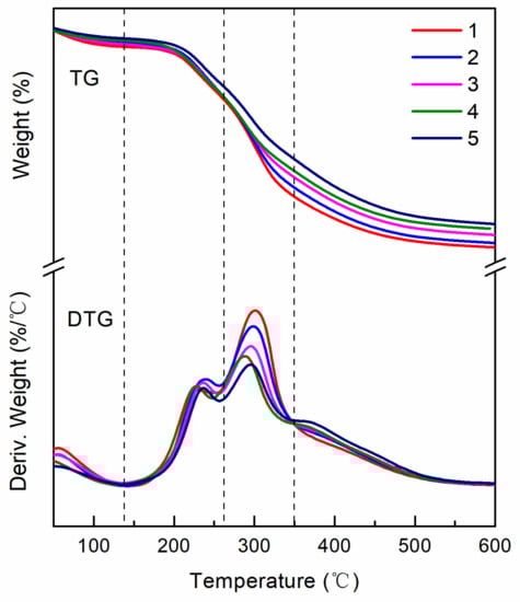 Thermogravimetric (TG) measurements were recorded on a TGA instrument (TA Q50, Waters Company, New Castle, DE, USA). Approximately 5 ± 0.1 mg of the 0.075 mm powder samples were placed in a platinum cup and then sealed in a nitrogen environment. The samples were then scanned while heated from 30 °C to 600 °C at a 10 °C/min. heating rate. Changes in the sample weight were recorded throughout and then analyzed [].