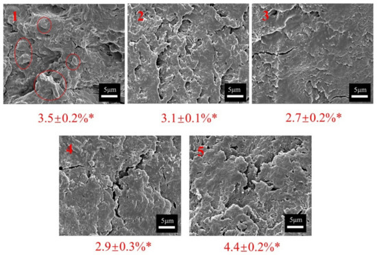 Figure 3 shows the fracture surfaces. The pure SM adhesive (adhesive 1) contained voids on the fracture surface and large protuberances in the red circles, which were attributed to the uneven adhesive system. This adhesive layer was easily broken by water, illustrating the adhesive’s water resistance. When the addition of PHTO reached 5 wt %, the fracture surface of adhesive 2 became smooth and compact. Further increasing the addition of PHTO to 10 wt %, the fracture surface of the adhesive samples became smoother and more compact with fewer protuberances due to the reaction between the PHTO and protein molecules which formed a denser crosslinked structure. As such, these experimental results are consistent with those of the FTIR spectra and the thermal stability analysis. As the PHTO addition increased to 20 wt %, adhesive 5 presented a disordered fracture surface again, which indicated that excessive amounts of PHTO caused its uneven distribution in the adhesive system, deteriorating its water resistance.