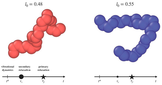 where σ* = 21/6σ is the minimum of the potential, . The potential is truncated at r = rc = 2.5σ for computational convenience. Adjacent bonded monomers interact with each other via the harmonic potential Ubond(r) = kbond(r − l0)2, where the constant kbond is set to to ensure high stiffness. We consider two distinct cases, corresponding to rest bond length l0 set to either l0 = 0.48σ or l0 = 0.55σ. The rationale behind our choice of the two bond lengths relies on the finding that previous Molecular-Dynamics (MD) simulations of the present model [14], investigating the rotational dynamics, revealed the steep increase of the separation between the primary and the JG relaxations by decreasing the bond length below (corresponding to 2Å in Figure 3 of Reference [14]). Therefore, one anticipates that the JG relaxation is much more apparent if l0 = 0.48σ with respect to l0 = 0.55σ. A bending potential Ubend(α) = kbend (cos α − cos α0)2, with kbend = 2000ϵ/σ2 and α0 = 120°, is introduced to maintain the angle α formed by two consecutive bonds nearly constant (see Figure 1 for typical chain conformations) [17].