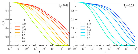 Temperature dependence of the bond correlation function of the chains with different bond length. If l0 = 0.48, a two-step decay—evidencing two distinct relaxations—is observed.