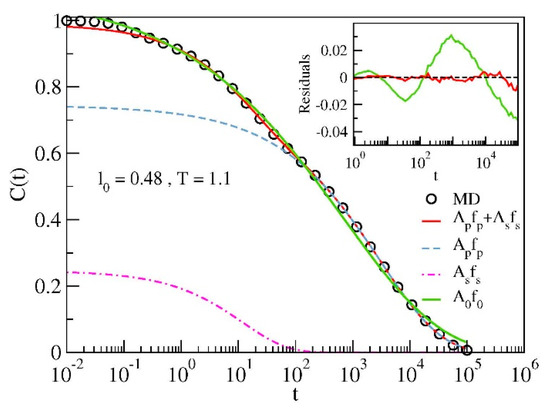 Figure 3 shows the result of the best-fit of C(t) with Equation (5) and Equation (6) for a representative state of the model. For comparison, the best-fit with a single stretched exponential decay is also shown. The residuals CMD(t) − Cfit(t) plotted in the inset of Figure 3 prove the poor performance of the single-relaxation curve to fit the MD data.