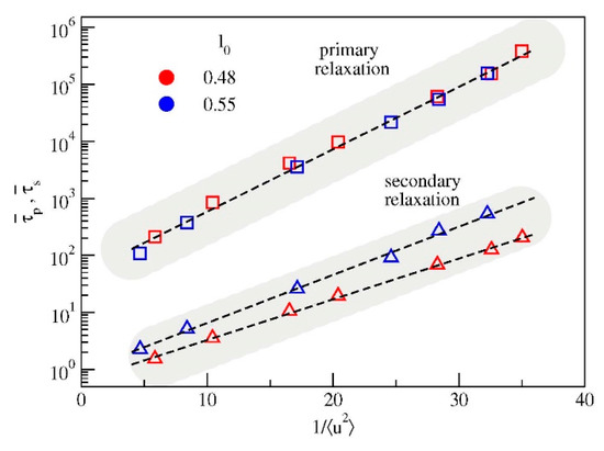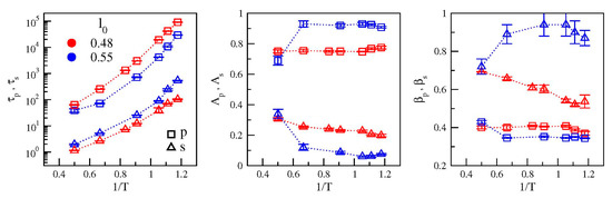 Figure 4 presents the temperature dependence of the parameters extracted from the best-fit of data with Equation (5) and Equation (6). It is seen that reducing the bond length has two major effects: (i) increased separation of the relaxation times τs and τp (ii) enhanced amplitude of the secondary relaxation with respect to the primary one. It is also worth noting that the primary relaxation is less stretched in the model where the secondary relaxation is more apparent (l0 = 0.48) with respect to the case in which it is weak (l0 = 0.55). The differences are small but significant, that is, larger than the errors on the stretching exponents. Stretched relaxation is usually associated with the presence of dynamical heterogeneities, namely the spatial distribution of mobilities, which may differ of orders of magnitude in regions only a few nanometers away. In this framework, our results suggest that the presence of a not negligible secondary relaxation process slightly decreases the degree of dynamical heterogeneity of the system. We plan to address this aspect in future works.