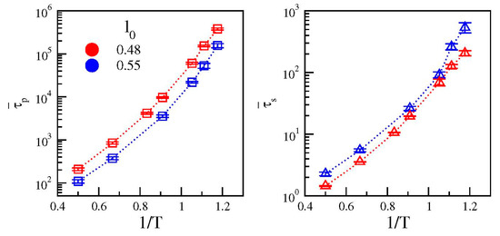 The temperature dependence of the average relaxation times of the two polymer models are shown in Figure 5. For both systems the primary relaxation time (left panel in Figure 5) grows more than three orders of magnitude in the range of temperature from T = 2.0 to T = 0.85, exhibiting a non-Arrhenius upward concavity which is typical of fragile glassformers [36]. Conversely, the growth of the secondary relaxation time (right panel in Figure 5) is less pronounced (approximately two and a half decades in the same temperature range) and the deviations from an Arrhenius behavior are weaker, in particular for the system with stronger secondary relaxation (l0 = 0.48, red symbols).