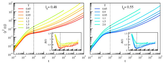Monomer mean square displacement (MSD) of the two polymer melts with chains having bond lengths l0 = 0.48 (left) and l0 = 0.55 (right). Inset: corresponding MSD slope ∆(t), Equation (9). The vertical dashed lines mark the time t* ≈ 1 where ∆(t) reaches the minimum, locating the time where caging is more effective. t* is found to independent of both the system and its physical state. The black circles indicate the values of , Equation (10).