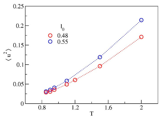 The position of is marked in Figure 6 with black circles. We remind that the DW factor provides a measure of the rattling motion of the monomer in the cage of the first neighbours. The temperature dependence of DW is reported in Figure 7. The dependence is not linear evidencing that, even at very short time scales, that is, (corresponding to a few picoseconds [11], see also Reference [37]), the rattling of the monomer in the cage is not harmonic. Notably, the two systems exhibit different curves for . In particular, at fixed temperature the system with chains having longer bond length exhibits larger DW factor.