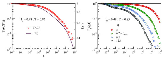 Figure 9 compares the bond correlation function C(t), Equation (4), with ISF and TACF at the lowest investigated temperature (T = 0.85, where the primary and the JG relaxation are expected to have the largest separation). A distinctive feature of C(t) at that temperature is the presence of the step at , signalling the secondary relaxation, see Figure 2, left. The step is clearly visible when C(t) drops ∼40% only. Figure 9, left, shows that the same step is also observed in TACF but when more than ∼90% of the decay has been completed. Namely, it is harder to be observed. Figure 9, right, plots ISF for different wavevectors in a range including q = qmax ∼ 2π/σ, corresponding to the maximum of the static structure factor. It is seen that there is no evidence of the two-step decay observed in the bond correlation function C(t) at the same temperature, see Figure 2, left. The results presented in Figure 9 are not unexpected. Previous MD studies [13] performed by using the same model of the present work (dubbed FRC model in Reference [13]) reported that ISF needs lower temperatures to reveal a two-step process in the relaxation. This suggests that ISF has lower JG resolution.