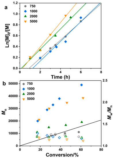 In an iron-mediated ATRP process, both the catalyst complexes and initiators have an effect on the polymerization activity. The coordination ability of PEO-Br depends on the electron-donating EO groups, and the number of EO groups in PEO-Br also exerts an influence on initiation activity [40,59]. PEO has the ability to chelate metals, and it can host several catalytic centers when its chain is sufficiently long. Therefore, the ligand-free iron-mediated ATRP process was built using the PEO-Br as both the ligand and the initiator. The 1H NMR spectrum of the synthesized PEO750-Br and PEO2000-Br is shown in Figure S1. The effects of the PEO-Br with different molecular weight and chain-end functionality on the polymerization kinetics were investigated under comparable experimental conditions.