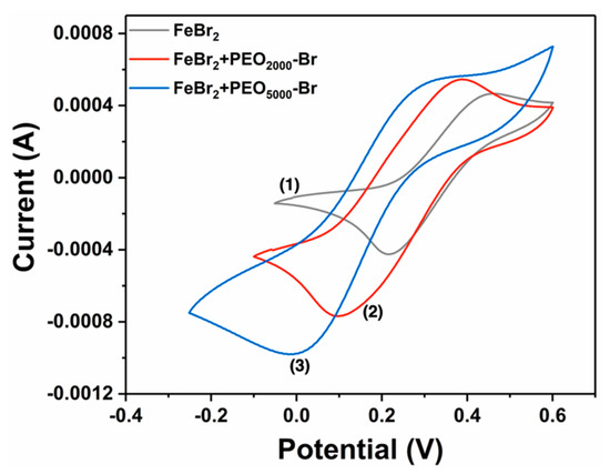 Cyclic voltammetry (CV) curves of 10 mM FeBr2 with different additives: (1) No additive; (2) 5 mM PEO2000-Br; (3) 5 mM PEO5000-Br under the electrolyte solution of 0.1 M Et4NBF4 in MeCN, recorded at a scan rate (V) of 50 mV s−1.