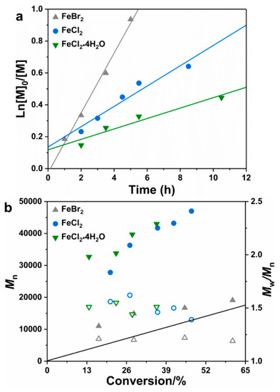 First-order plots (a) and evolution of Mn and Đ with conversion (b) for the bulk iron-catalyzed MMA polymerization in the presence of different iron catalyst. [MMA]:[x]:[PEO2000-Br] = 200:1:1, x = FeBr2, FeCl2 or FeCl2•4H2O, T = 60 °C.