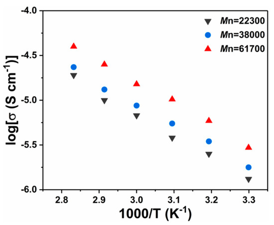 Figure 5 presents the temperature-dependence ionic conductivity for the P(EO-PEGMA)/PVDF polymer electrolyte doped with LiClO4 (EO/Li+ = 15). The effect of different molecular weights of P(EO-PEGMA) polymer was studied (the composition of the polymer electrolyte is shown in Table 3, entries 1–3). The original AC impedance spectra are shown in Figure S5. From the results we can see that the ionic conductivities of the polymer electrolyte increased directly proportional to the molecular weight of the P(EO-PEGMA) due to the improved mobility of the polymer segments with the incremental number of EO groups.