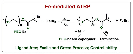 - Ding, M.; Jiang, X.; Peng, J.; Zhang, L.; Cheng, Z.; Zhu, X. An atom transfer radical polymerization system: Catalyzed by an iron catalyst in PEG-400. Green Chem. 2015, 17, 271–278. [Google Scholar] [CrossRef]