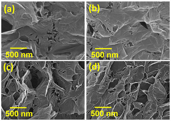 SEM micrographs of (a) HGNS-300; (b) HGNS-700; (c) HGNS-900; and (d) HGNS-1100 samples.
