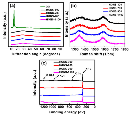The crystallinity of various samples was characterized by XRD. In Figure 2a, the GO sample shows a characteristic peak at a 2θ angle of 11.8°, indicating a significantly enlarged interlayer distance due to the existence of oxygen-containing groups between the graphitic layers. However, after thermal reduction, this diffraction peak disappears, and only an extremely broad and weak peak is found at around 27°. These results indicate that the oxygen-containing functional groups were reduced. At the same time, the graphite layers peeled off [32], losing the ordering structure along the c axis. It was found that all the HGNS samples exhibited similar XRD patterns. A temperature of 300 °C is sufficient to exfoliate the GO, producing few-layer graphene nanosheets.