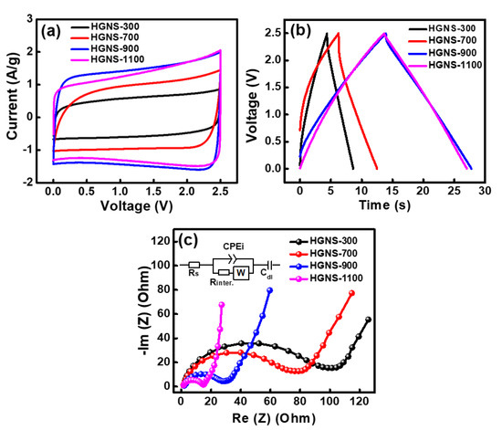 Figure 3c shows the EIS spectra of various cells. The Nyquist plots are characterized by a semicircle at high frequency and a straight line at low frequency [36]. The diameter of the semicircle can be mainly attributed to the interface contact resistance (Rinter.) between the HGNSs [37]. Table S1 (Supplementary Materials) shows the Rinter. values of various cells. The HGNS-300 and HGNS-700 cells exhibited Rinter. values of 100 and 75 Ω, respectively. The high resistance is responsible for the unsatisfactory electrochemical properties shown in Figure 3a,b. Increasing the temperature beyond 700 °C effectively reduced the Rinter., which is in line with the oxygen concentration variation trend shown in Table 1. The results indicate that the reduction of oxygen-containing functional groups on HGNSs can decrease the contact resistance between graphene sheets. The Rinter. values for the HGNS-900 and HGNS-1100 cells were 26 and 16 Ω, respectively.